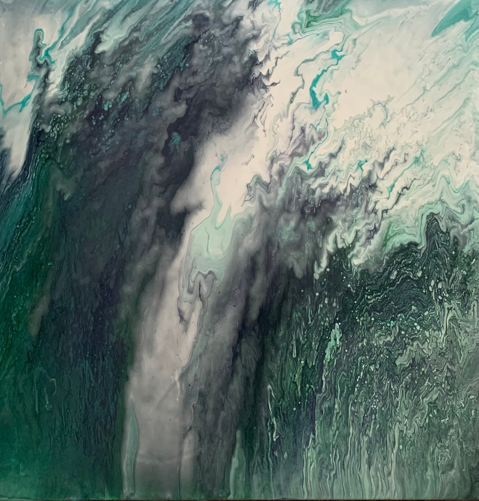 Each piece of Sandra’s art reflects her willingness to experiment and push the boundaries of conventional art. Her method of paint pouring consists of layers of acrylic paint swirled together on the canvas, like the splashing water the pieces represent. Sandra prefers to keep her art unnamed so audiences can experience the pieces with their own thoughts without the influence of the artist’s context.